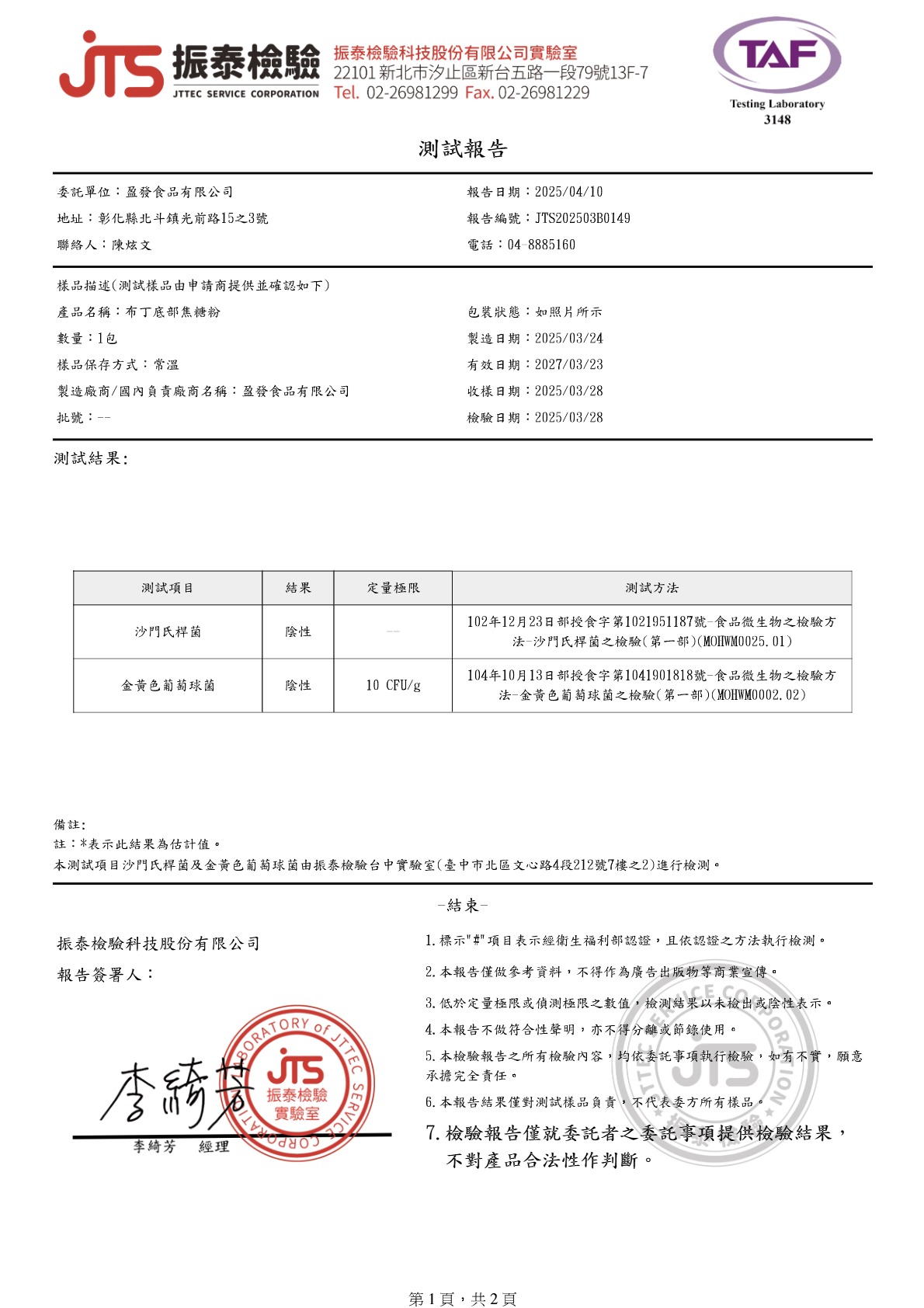 布丁底部焦糖粉檢驗報告